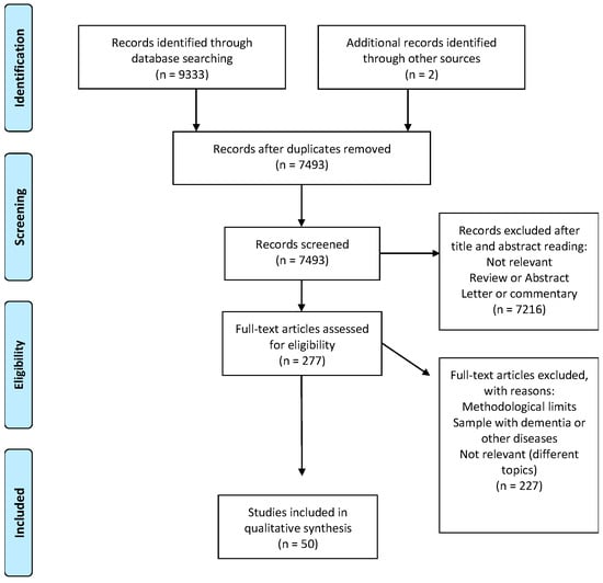 The initial search produced 9335 articles. After excluding 1842 duplicates, 7443 articles were rejected according to the analysis of both title and abstract. Finally, 277 studies were reviewed and subjected to the quality assessment. At the end of the review process, 50 articles were identified as fitted with the aims of this systematic review.