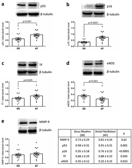 In this study, we investigated the link between AF and senescence markers through the assessment of protein expression in the tissue lysates of human appendages from patients in AF and in sinus rhythm (SR). The protein expression levels of p53, p16 (a down-stream modulator of cell cycle arrest), tissue factor (TF, the cellular initiator of the coagulation cascade), MMP-9 (a matrix metalloproteinase involved in extracellular matrix remodeling), and eNOS (the pivotal endothelial NO synthase that participates in redox-induced senescence and endothelial dysfunction when down-regulated) were investigated. Immunohistological staining of p53, p16, and eNOS were also performed on appendage sections of AF and SR patients.