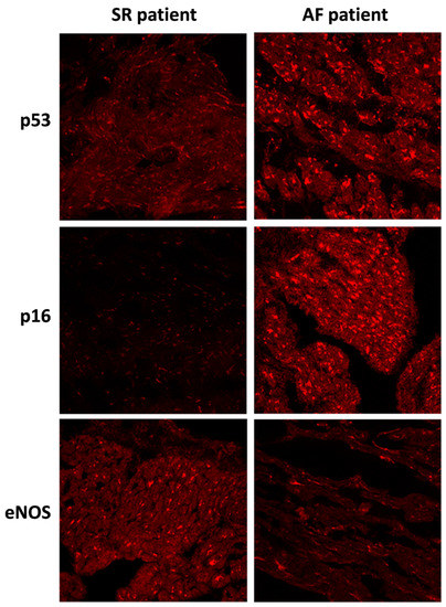 Changes in protein levels, as assessed by WB, were confirmed by immunohistological analysis of the fresh-frozen OCT-embedded RAA sections. The level of p53 and p16 staining was pronounced in the AF group compared to the SR group. Conversely, the level of eNOS staining was decreased in the AF group compared to the SR group (Figure 2).