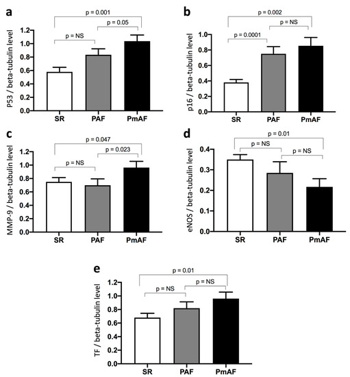 Expression of (a) p53, (b) p16, (c) MMP-9, (d) eNOS, and (e) TF in right atrial appendages from patients according to sinus rhythm (SR), paroxysmal (PAF), or permanent atrial fibrillation (PmAF). Protein expression was determined by Western blot analysis of 21 human right atrial appendages in SR, 11 in PAF, and 10 in PmAF. Results are expressed as mean ± SEM (NS, non significant).