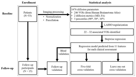 Previous DTI analyses have been focused on white matter damage and frequently relied on complicated algorithms for accurate fiber tracking []—ultimately being unsuitable for routine clinical use. Notably, our current approach for predicting severity scores was not based on white matter tractography or connectivity analysis. We rather performed a reconstruction of the diffusion tensor followed by image normalization and parcellation—a method that can be easily implemented in a clinically-oriented environment with the use of freeware software SPM [] or FSL (Functional magnetic resonance imaging of the brain Software Library []).