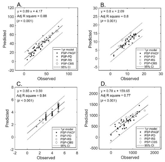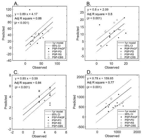 It can be observed that the prediction of LEDD in the validation cohort slightly deviated from the forecast-being characterized by the lowest adjusted R2 in the original model (leave-one-out/five-fold cross validation = 0.772 ± 0.008/0.739 ± 0.047). The response of patients with PSP to levodopa may be either absent or transient. However, there may be differences in the clinical spectrum of disease—with patients with PSP-RS showing poorer response than those with PSP-P []. The predominant inclusion of patients with PSP-P (as in our study) may lead to an underestimation of the predictive value. Notably, it has been previously suggested that common criteria for defining the response of patients with PSP to levodopa may not be entirely accurate and thus need further examination []. Similarly, our findings related to LEDD require additional validation in larger studies.