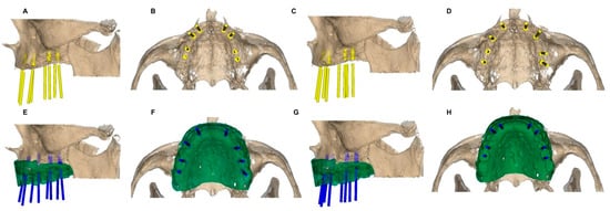 Two hundred dental implants (BioHorizons; Birmingham, AL, USA) were planned in tooth positions 2.6, 2.5, 2.3, 2.2, 1.2, 1.3, 1.5, and 1.6 (4.6 × 12 mm, conical wall and internal taper) in a virtual model of a totally edentulous upper jaw (Sawbones Europe AB; Malmo, Sweden), obtained from a real clinical case. The case selected presented a high amount of available bone and was scheduled for a fixed implant-supported prosthesis. The datasets were uploaded and aligned in a 3D implant-planning software (NemoStudio®, Nemotec; Madrid, Spain) to allow dental implant planning by the following study groups: A. dental implant planning by dental surgeons with 5–10 years of experience (n = 80); and B. dental implant planning by dental surgery students without experience (n = 120). The dental implant planning was performed in a 3D implant-planning software (NemoStudio®, Nemotec; Madrid, Spain) by each operator before (Figure 1A–D) and after (Figure 1E–H) uploading and aligning the digital mock-up, which was obtained after scanning the complete denture of the patient, to evaluate the influence of the digital mock-up on the dental implant planning position.