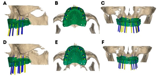 Dental implant planning before (yellow cylinders) and after (blue cylinders) using the digital mock-up in both study groups (5–10 years’ experience (A–C) and no experience (D–F)).