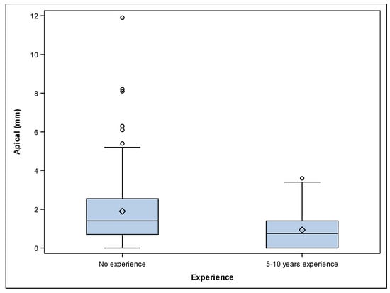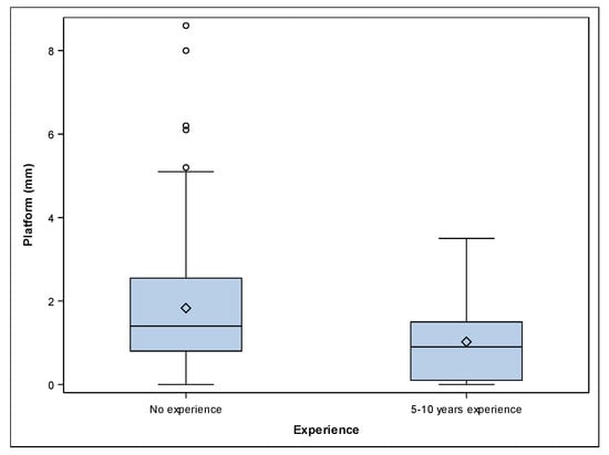 The paired t-test revealed statistically significant differences between the platform deviations of 5–10 years’ experience and the no experience study groups (p ˂ 0.001). A mean deviation of 0.93 ± 1.02 mm (min: 0.00 mm, max: 3.60 mm) and 1.90 ± 1.90 mm (min: 0.00 mm, max: 11.90 mm) was observed at the apical endpoint of the 5–10 years’ experience (Figure 2A–C) and no experience (Figure 2D–F) study groups, respectively (Figure 4).