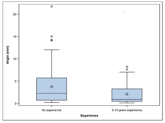 The paired t-test revealed statistically significant differences between the apical deviations of participants with 5–10 years’ experience and no experience (p ˂ 0.001). A mean angular deviation of 2.06° ± 2.17° (min: 0.10°, max: 8.20°) and 3.73° ± 3.88° mm (min: 0.20°, max: 21.70°) was observed in the 5–10 years’ experience (Figure 2A–C) and no experience (Figure 2D–F) study groups, respectively (Figure 5). The paired t-test revealed statistically significant differences between the angular deviations of 5–10 years’ experience and no experience study groups (p = 0.002).