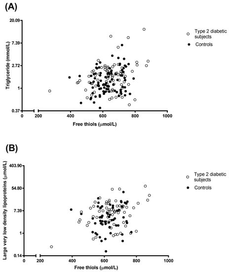 Figure 1. Univariate correlations of plasma free thiols with plasma triglycerides (panel A; 79 type 2 diabetic subjects and 89 subjects without diabetes) and with very large very low density lipoprotein (VLDL) (panel B; 66 type 2 diabetic subjects and 58 subjects without diabetes). Legend: closed symbols represent subjects without diabetes; open symbols represent subjects with type 2 diabetes. The log transformed data (i.e., triglyceride and large very low density lipoproteins) were used. The back transformed measures are shown on the Y-axis. Pearson correlation coefficients: free thiols with triglycerides; all subjects, r = 0.285, p < 0.001; Type 2 diabetic subjects, r = 0.290, p = 0.01; subjects without diabetes, r = 0.260, p = 0.014. Free thiols with large VLDL: all subjects, r = 0.266, p = 0.003; Type 2 diabetic subjects, r = 0.333, p = 0.006; subjects without diabetes, r = 0.138, p = 0.31.