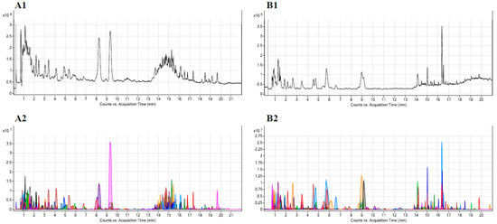 Representative chromatograms obtained from a urine sample: total ion chromatogram (TIC) in positive (A1) and negative (B1) detection modes; extracted compound chromatogram (ECC) in positive (A2) and negative (B2) detection modes.