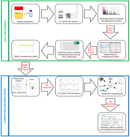 Representation of the untargeted workflow applied to analyze urine samples. In the green box are the steps involved in data processing; in the blue box are the steps regarding compound identification. In the arrows are reported the number of features or compounds obtained by the different steps, in positive (+) or negative (−) ionization modes. LC-QTOF-MS: Liquid Chromatography–Quadrupole Time-of-Flight–mass spectrometry; PCA: Principal Component Analysis; OPLS-DA: Orthogonal Partial-Least-Squares Discriminant Analysis; QTOF-MS/MS: Quadrupole Time of Flight-tandem mass spectrometry.