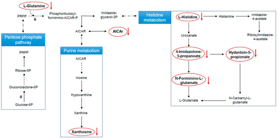 In the samples collected after ASA treatment, the effect on the histidine pathway is documented by the decrease of L-histidine and three major histidine catabolites: hydantoin-5-propionate, 4-imidazolone-5-propanoate, and N-formimino-L-glutamate (Figure 3). The involvement of the purine pathway was also confirmed by xanthosine reduction (Figure 3). Finally, L-glutamine and 5-aminoimidazole-4-carboxamide-1-β-D-ribofuranoside (AICAr) reduction was found, with AICAr being a link between the histidine and the purine metabolism.