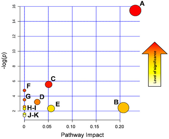 Pathway enrichment analysis showing the nodes in the graphic depicting the metabolic pathways affected by 7 day treatment with ASA 100 mg once daily. On the y-axis, the –log (p) value represents the quantitative perturbation of pathways. On the x-axis, the pathway impact value refers to the centrality of a metabolite in the metabolic network. The node color, varying from yellow to red, is based on its p value, and the node radius is determined on the basis of their pathway impact values. A: histidine metabolism; B: alanine, aspartate, and glutamate metabolism; C: purine metabolism, D: D-glutamine and D-glutamate metabolism; E: valine, leucine, and isoleucine biosynthesis, F: nitrogen metabolism; G: aminoacyl-tRNA biosynthesis; H: caffeine metabolism; I: β-alanine metabolism; J: pyrimidine metabolism; K: arginine and proline metabolism.