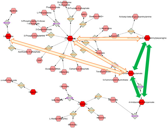 Metabolic pathway network interaction. Colored arrows represent the linear Pearson correlation of >0.3 among the identified metabolites (green: positive correlations; orange: negative correlations). The dark green lines refer to nominally significant correlations. The hexagons indicate metabolites (dark red: identified metabolites; light red: predicted metabolites), while the diamonds represent compound reactions (violet: reversible reactions; orange: irreversible reactions).