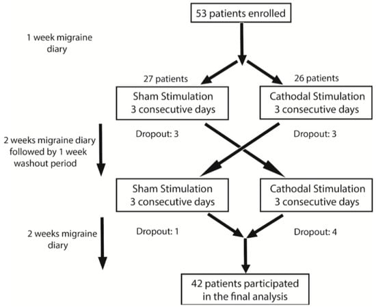 Various non-pharmacological treatments, such as vagal nerve stimulation, occipital nerve stimulation, and transcranial magnetic stimulation, have been tested in episodic migraine with variable results [,]. Transcranial direct current stimulation (tDCS) is a safe, practical, and widely available method to modulate cortical excitability [,]. It has been suggested that tDCS is effective in preventing migraine attacks based on its ability to correct abnormal cortical excitability [,,,,,,]. We conducted a randomized, double-blind, sham-controlled study, with an active three-day intervention phase, to investigate the efficacy and side effects profile of tDCS as a preventive treatment of episodic migraine.