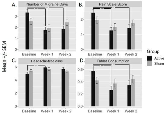 Therefore, four output measures were calculated before and after (at week 1 and week 2) each block (sham and active). These include the following: number of migraine days at baseline, week 1 and week 2; mean of migraine pain intensity (VAS) at baseline, week 1, and week 2 (i.e., VASbaseline, VASweek1, and VASweek2); number of migraine tablets/week at baseline, week 1, and week 2; and number of headache-free days/week at baseline, week 1, and week 2.