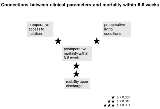 Limited access to daily nutrition, impaired mobility and dependent living conditions prior to surgery facilitate postoperative mortality within 6–8 weeks after surgery. The mobility upon discharge has a major impact on postoperative survival. Preoperative improvements on these basic clinical parameters as well as supporting postoperative mobility and self-sufficiency significantly reduces postoperative mortality [45,51].