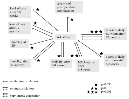 There was a strong (r = −0.544) and significant (p = 0.017) coherence between the mobility of the patients upon discharge and the MNA status after 6–8 weeks. The MNA status after 6–8 weeks correlated even stronger (r = −0.761) and significantly (p < 0.001) with the mobility after 6–8 weeks. There was a strong (r = −0.527) and significant (p = 0.010) connection between the AA status at T4 and the mobility after 6–8 weeks. This correlation was still strong (r = −0.525) and significant (p = 0.025) after 12 months. The preoperative level of care strongly (r = 0.608) and significantly (p = 0.001) affected the preoperative mobility as well as the mobility upon discharge (r = 0.513) (p = 0.010).