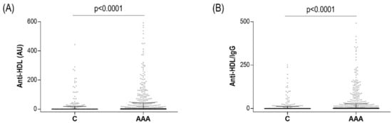 Immune mechanisms are involved in AAA [18,19]. AAA patients are characterized by features of autoimmunity and lipid deposits in the wall of diseased aorta [20,21]. Emerging evidence from autoimmune diseases has revealed that the presence of autoantibodies directed against HDLc (IgG anti-HDL) may explain, at least in part, an impaired lipid profile in these conditions and they were associated with a number of disease outcomes [22,23,24,25]. Interestingly, similar results have been found in other non-autoimmune CVD conditions [26,27], hence suggesting that anti-HDL antibodies can be a common, shared mechanism across different conditions. However, whether these antibodies could be found in AAA is still unknown.