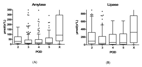 The amylase concentrations in the drainage fluid were determined in 786/669/450/404 of patients from POD 2 to 5, respectively, and in 52 patients on the day of POPF diagnosis (X) (Figure 1A). A threefold-elevated amylase concentration was found in 251/242/135/99 (i.e., 32%/36%/30%/25%) of the patients on PODs 2–5, respectively, and in 39 patients on POD X (Figure 2). In comparison, the lipase concentrations in the drainage fluid were determined in 776/661/448/401 of the patients on PODs 2–5, respectively, and in 63 patients on POD X (Figure 1B). A threefold-elevated lipase concentration was found in 246/237/146/123 (i.e., 32%/36%/33%/31%) of the patients on PODs 2–5, respectively, and in 49 patients on the POD X (Figure 2).