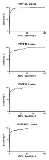 Subgroup analysis revealed a sensitivity of 92% and a specificity of 88% for lipase (cutoff > 3.08, AUC = 96; CI = 0.95–0.98; p = <0.0001) for patients with a BL. For patients with a grade B fistula, the sensitivity and specificity of lipase were 89% and 86%, respectively (cutoff 2.84, AUC = 0.94; CI = 0.91–0.98; p = <0.0001). In patients with a grade C fistula, the sensitivity and specificity of lipase were 88% and 94%, respectively (cutoff > 4.88, AUC = 0.96; CI = 91–1.00; p = <0.0001). Optimal lipase cutoff in patients with a CR-POPF (grade B/C) was > 4.88 with a sensitivity of 87% and specificity of 94% (AUC = 0.95; CI = 0.92–0.98; p < 0.0001) (Figure 3).