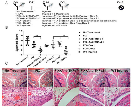 - “FIX + Dex2”: Dex was administrated on day 7 every other day for a total 10 doses, a schedule identical to the “FIX + Anti-TNFα7” group;