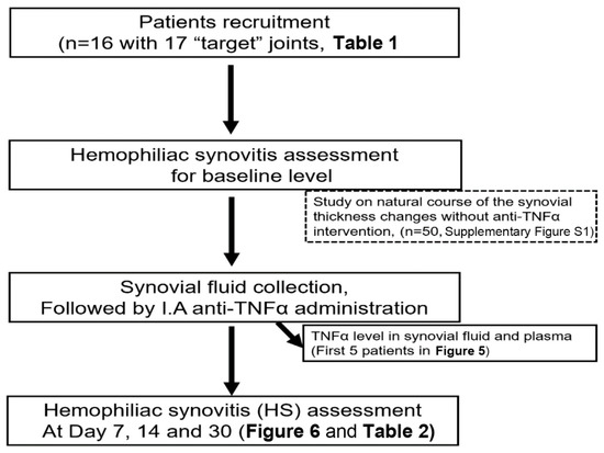 In order to observe the natural course of the synovial thickness changes without anti-TNFα therapy in hemophilia patients with “target” joints, a total of 50 joints from 14 patients, either on low dose prophylaxis (11/14, FVIII concentrates 8–12 IU/kg, 2–3 times per week) or on-demand therapy (3/14), were retrospectively reviewed. Joints were monitored by ultrasound in a period of 3 to 12 months (Supplementary Materials Figure S1).