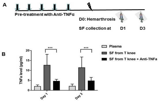 3.1. Hemarthroses Elevated TNFα while Anti-TNFα Decreased TNFα Production in Synovial Fluid