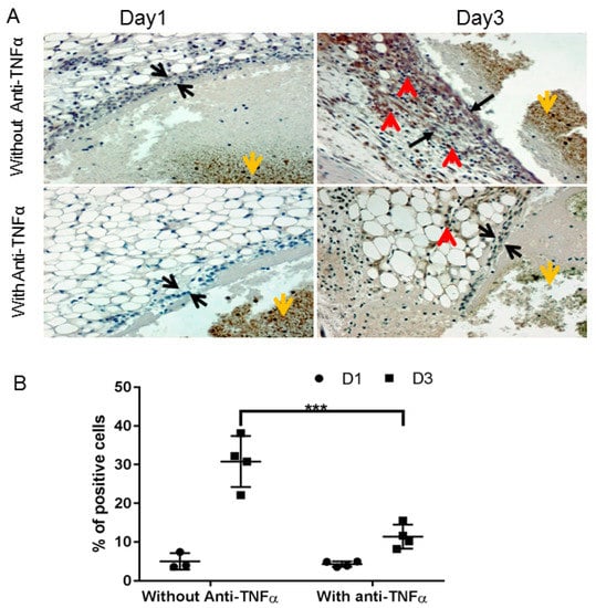 Anti-TNFα decreased macrophage infiltration/proliferation into the synovium. (A): FIX−/− mice were pre-treated with 5 doses of etanercept 5 mg/kg s.c., as described in Figure 1A (“With Anti-TNFα”); mice in control group were treated with normal saline (“Without Anti-TNFα”). Hemarthrosis was induced by needle injury on the left knee joint. Days 1 and 3 after hemarthrosis induction, the treated knee joint was collected for macrophage immunochemistry staining as described in Methods. Black arrow represents the synovial lining; red arrow depicts positive macrophage staining; and yellow arrow represents the flesh blood hemorrhage in the joint space. (B): Quantitative analysis, percentage of positively stained cells, were performed by counting of cells in synovium. *** p < 0.01.