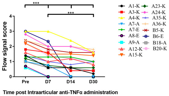 Intra-articular (I.A) administration of the TNFα antagonist decreased synovial vascularity. Synovial vascularity was detected by Power Doppler Ultrasound. As described in Section 2.2, colorful blood flow signals which were found between the capsule and bone surface inside the structures were observed decreased on days 7, 14 and 30 post-I.A administration in comparison to signals pre-treatment, respectively. *** p < 0.001.