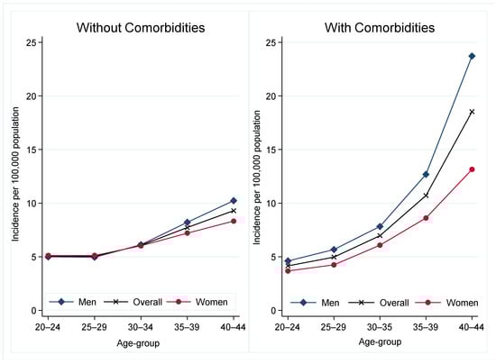 | 40–44 | 3004 | 28.62 | 1.96 (1.74, 2.19) | 1.48 (1.30, 1.68), <0.001 |
