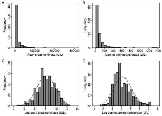11]. These studies have focused on the temporal association rather than functional form, and thus not attempted to quantify this relationship. Weibrecht et al. reviewed 215 cases of rhabdomyolysis and examined the trajectory of the CK and aminotransferases (ALT and AST). Much like our data, the investigators noted that peak CK and ALT were not normally distributed. They used a stratified analysis and non-parametric tests to show differences in the ALT levels between the strata of peak CK levels [