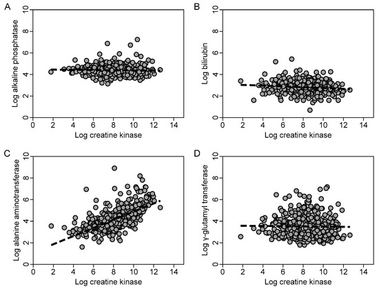7]. In our study, we have maintained the interval level of measurements by regressing the log ALT on log pCK. Therefore, we could draw a quantitative inference from our analysis which, to our knowledge, has not been previously reported.