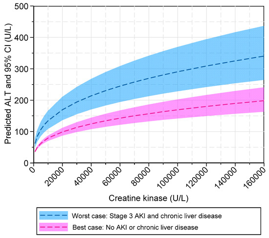 We made the assumption that no other potential sources of ALT besides skeletal muscle and liver (e.g., unrecognized myocardial injury) contributed to the elevated ALT in patients with rhabdomyolysis. We also assumed that no specific treatment (e.g., fluid resuscitation) confounded the association between log pCK and ALT. Currently, it is unclear if fluid resuscitation can affect ALT levels independent of CK. As treatment effect could not be reliably quantified in our study and tested in our regression models, this remains a possibility that may have biased our estimates. However, if the endpoint of successful fluid resuscitation is prevention of AKI, then this covariate is already included in the multivariable analysis and could have accounted for treatment effect.
