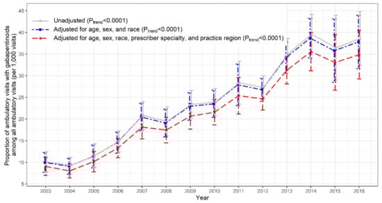 The following are available online at https://www.mdpi.com/2077-0383/9/1/83/s1, Table S1: Multum Lexicon Plus® generic codes used to identify gabapentinoids, opioids, and benzodiazepines; Table S2: ICD-9-CM/ICD-10-CM codes used to identify FDA-approved indications for gabapentinoids, Figure S1: Trends in use of gabapentinoids by gabapentin vs. pregabalin in the US ambulatory settings: 2003–2016 National Ambulatory Medical Care Survey (NAMCS), Figure S2: Trends in proportion of ambulatory care visits with gabapentin use among all US ambulatory care visits: 2003–2016 National Ambulatory Medical Care Survey (NAMCS), Figure S3: Trends in proportion of ambulatory care visits with pregabalin use among all US ambulatory care visits: 2003–2016 National Ambulatory Medical Care Survey (NAMCS), Figure S4: Trends in proportion of ambulatory care visits with gabapentinoid use, stratified by age, sex, race/ethnicity, and smoking status: 2003–2016 National Ambulatory Medical Care Survey (NAMCS), Figure S5: Trends in proportion of ambulatory care visits with gabapentinoid use, stratified by concurrent use of opioids and benzodiazepines and number of chronic conditions: 2003–2016 National Ambulatory Medical Care Survey (NAMCS), Figure S6: Trends in proportion of ambulatory care visits with gabapentinoid use, stratified by insured status, major visit reason, and physician specialty and geographic region of practice location: 2003–2016 National Ambulatory Medical Care Survey (NAMCS), Figure S7: Trends in use of gabapentinoids in US ambulatory care settings, by including first eight medications and all medications available each year: 2003–2016 National Ambulatory Medical Care Survey (NAMCS).