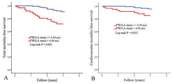 Kaplan–Meier curves for total mortality-free survival ((A), log-rank p < 0.001) and cardiovascular mortality-free survival ((B), log-rank p = 0.012) in all study patients subdivided according to the ratio of transmitral E wave velocity (E) to left atrial (LA) strain >4.56 m/s or not.