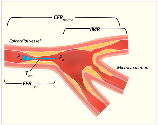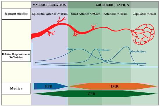Although invasive direct visualization of the microcirculation at the time of coronary angiography is not possible, [] techniques such as coronary flow reserve (CFR), pressure-derived fractional flow reserve (FFR) and the index of microcirculatory resistance (IMR) have allowed for safe and reliable quantification of coronary blood flow (and the relative contribution of epicardial stenosis to the pressure-flow relationship) in the catheterization lab. Other available tools which are beyond the scope of our discussion are: (i) Doppler-flow-derived indices, e.g., diastolic flow deceleration, systolic flow reversal or coronary flow velocity reserve (CFVR), and (ii) Doppler-flow/pressure-derived indices, e.g., hyperemic microvascular resistance (HMR), zero-flow pressure (Pzf) and wave-intensity analysis (WIA).