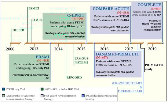 Timeline of Physiologic-Guided Landmark Clinical Trials in Acute Coronary Syndromes using Fractional Flow Reserve. (* prospective registry study). IRA = infarct-related artery; N-IRA = non-infarct-related artery; PCI = percutaneous coronary intervention; NSTE-ACS = non-ST-segment acute coronary syndromes; IHD = ischemic heart disease, FFR = fractional flow reserve, iFR = instantaneous wave-free ratio. FAME = FFR versus Angiography for Multivessel Evaluation.