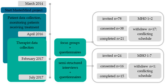 Through other users of the Minddistrict platform and personal contacts of the authors, 10 MHOs were invited to be part of the study because they implemented an online platform into routine care. One MHO withdrew because it ceased to exist, another MHO was too busy with ongoing other projects and trials, and one MHO switched to a different platform provider and needed time to explore other providers. In total, seven MHOs participated.