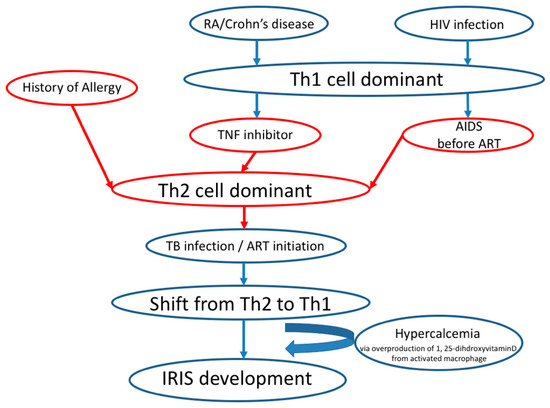 In this study, a significant relationship was found between IRIS development and history of allergy. Most of the food allergies and a part of drug allergies are thought to be an immunoglobulin (IgE)-mediated, Th2 cell-dominant immune response. Initiation of antiretroviral therapy (ART) for HIV patients is associated with a shift from the Th2 to Th1 cell balance, together with IRIS development [24,25]. Patients with a history of allergy or TNFI treatment and patients with the progression of HIV infection to acquired immune deficiency syndrome (AIDS) before ART [26] are in Th2 cytokine-dominant balance. Recently, it has been reported that TNFI treatment for RA deteriorated asthma symptoms, while benralizumab, an anti-IL-5 receptor antagonist, worsened arthritis in a patient with RA-complicated with asthma [27]. This case report indicates that the blockage of the Th1-dominant balance by TNFI treatment promotes the Th1 to Th2 shift and worsens the Th2-dominant disorder, and the inhibition of Th2-dominant balance by IL-5 antagonist initiates Th2 to Th1 shift and deteriorate Th1 dominant disease. There is a possibility that the shift from the Th2 cell cytokine-dominant balance to the Th1 cell cytokine-dominant balance caused by TB infection in a patient with a history of allergy may have influenced IRIS development (Figure 2). Further studies are required to elucidate the mechanism underlying the development of IRIS, which is caused by Th1 cell-dominant balance [2], from the Th2 cell-dominant balance in TB patients with TNFI treatment or history of allergy.