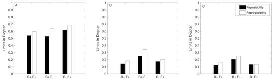 Figure 1 shows the repeatability and reproducibility limits of each autorefractor for the M (Figure 1A), J0 (Figure 1B), and J45 (Figure 1C). For all the instruments, the repeatability limits were smaller than the reproducibility limits for each vectorial component. However, the differences never exceeded 0.07D for both fogging instruments. For the B− F+, the maximum difference between the repeatability and reproducibility limits was 0.10D.