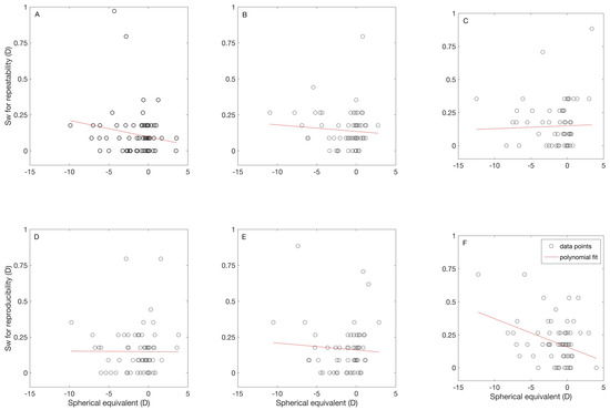 Correlation between spherical equivalent and within subject standard deviation for repeatability (A–C) and reproducibility (D,E) for each instrument. The results for the binocular instrument with fogging are shown in (A,D), for the binocular instrument without fogging are shown in (B,E), and for the monocular instrument with fogging are shown in (C,F).