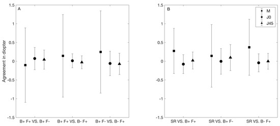 Figure 3A summarizes the agreement values between the autorefractors. In this figure, the symbols and error bars represent the mean difference and 95% limits of agreement, respectively. On average, the smallest (0.10D) and largest (0.25D) difference in M was seen between the two binocular instruments, and between B+ F− and B− F+, respectively. The limit of agreement interval was about 2.00D for each comparison.