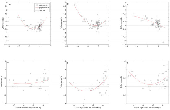 Figure 4A–C show the relationship between the differences and the mean M for the autorefractor comparisons. The red line represents the quadratic polynomial curve fit of the data. The B+F+ showed a “U” shaped curve with the other two autorefractors. Compared to B+ F+, B+ F− tends to provide less myopic values for mean M between −7.00 D to +0.25 D. Whereas, B− F+ tends to provide more myopic values in general. A trend was seen between the difference and mean M of the comparison of B+F− and B−F+. The B−F+ showed more myopic values as the mean M becomes more myopic.