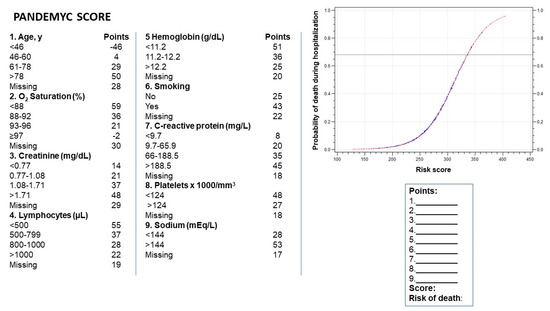 The final model included the following variables: age; oxygen saturation at admission; smoking or ex-smoking; and serum creatinine, lymphocytes, hemoglobin, sodium, platelets, and C-reactive protein at admission. We used these variables to build the acronym PANDEMYC (Platelets, Age, Natremia, Kidney injury, Lymphopenia, Oxygen saturation, C-reactive protein) to name the score (Figure 1)