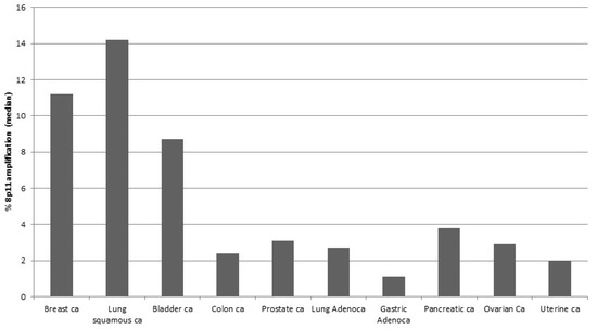 Percentage of the 8p11.23 amplicon expression in common types of cancer. Data are from The Cancer Genome Atlas (TCGA) studies. ca: Cancer.