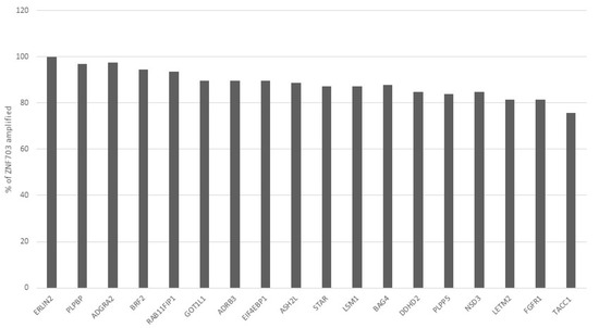 Percentage of cases with amplification of each of the other 8p11.23 genes in samples with ZNF703 amplification in TCGA breast cancer study. The closer neighbors of ZNF703, ERLIN2, ADGRA2, BRF2 and RAB11FIP1 display the higher frequency of co-amplification with a gradual decrease of the frequency of co-amplification in the more remote genes.