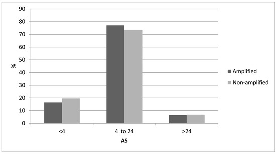 Percentage of cases with the 8p11.23 amplicon and without the amplicon and Aneuploidy Score (AS) of less than 4, between 4 and 24 and above 24. Data from the TCGA study.