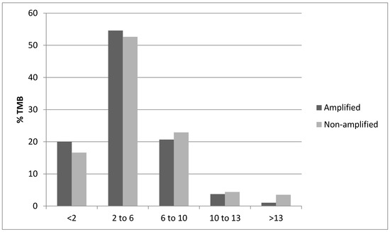 Percentage of cases with the 8p11.23 amplicon and without the amplicon and Tumor Mutation Burden (TMB) of different levels. Data from the METABRIC study.