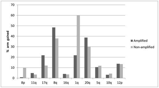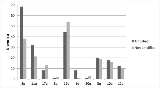 Percentage of chromosome arm losses in breast cancer samples with the 8p11.23 amplicon and without the amplicon.