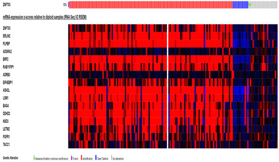 mRNA expression of amplicon genes in cases with ZNF703 amplification (as a marker of amplicon presence). In the right side of the grid, cases with deletion of the amplicon or normal expression are shown for comparison.