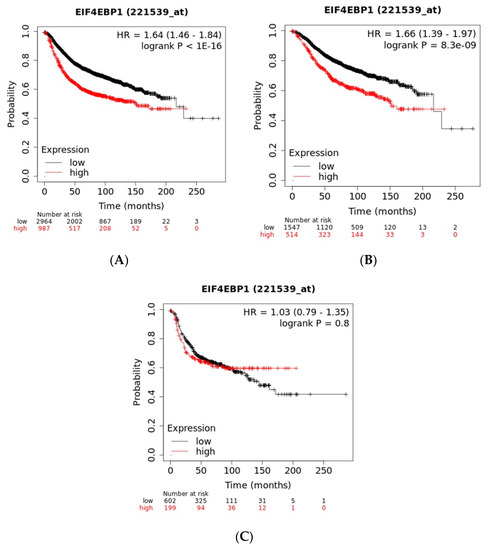 Recurrence-free survival in patients with high mRNA expression of EIF4EBP1 (the higher quartile of the cohort) compared with patients with lower mRNA expression. (A) Across breast cancer sub-types; (B) in ER (Estrogen Receptor) positive breast cancers; (C) in ER negative breast cancers.